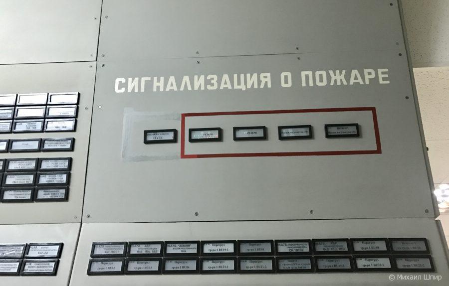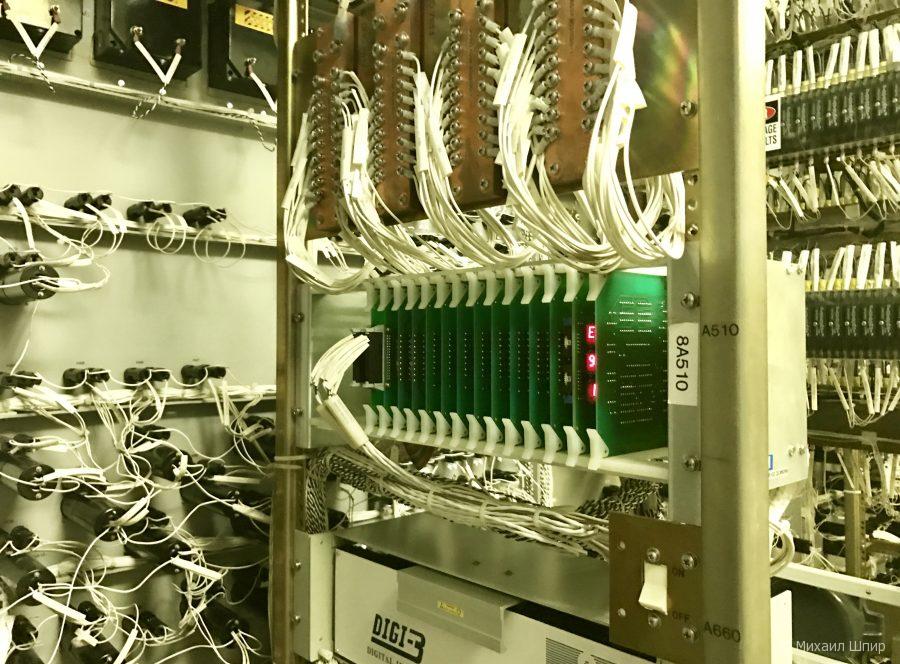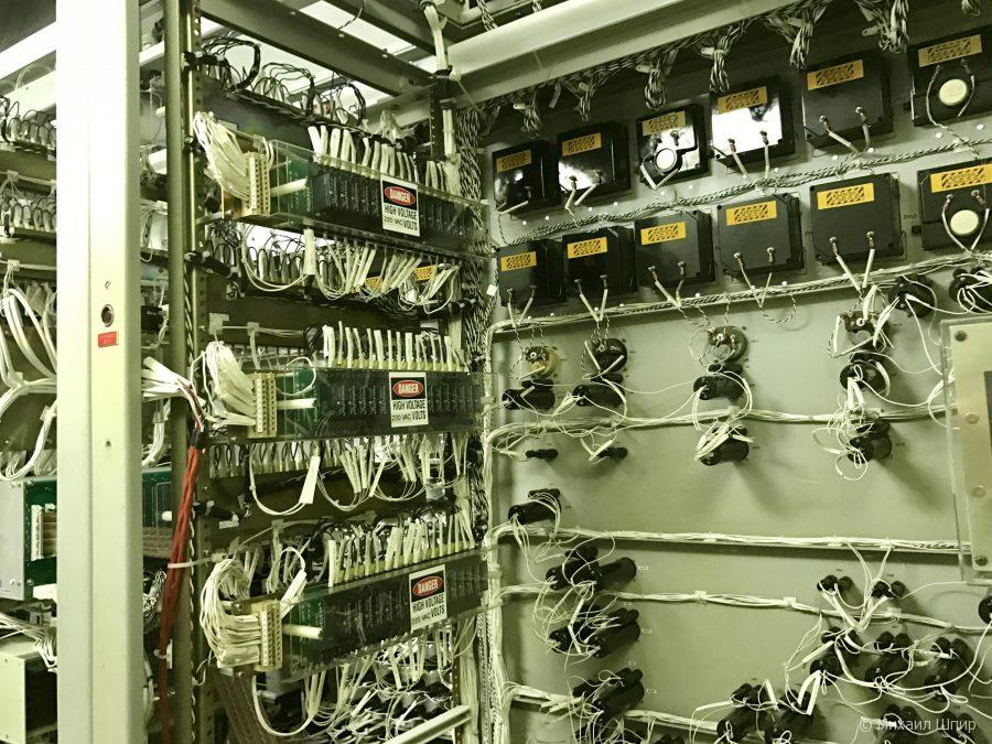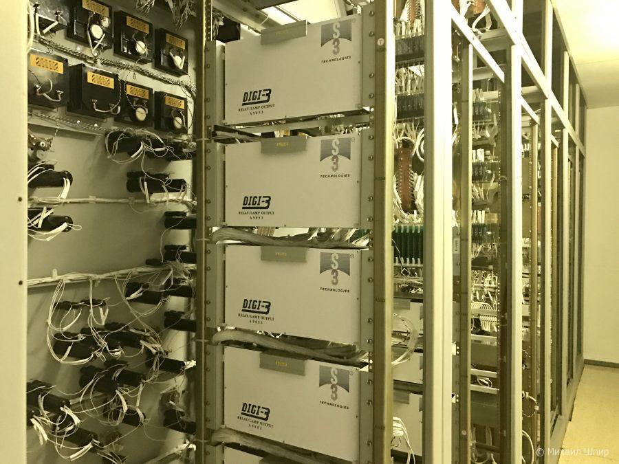 Удалось даже рассмотреть обратную часть информационных панелей — заглянуть за стенку и наткнуться на десятки метров серверных стоек и дублирующих аналоговых подсистем с лампочками и зуммерами: